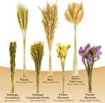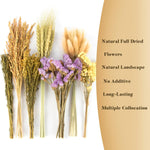 Natural dried floral mix – includes carefully selected flowers such as yellow and light purple myosotis, wheat, rabbit tails, solidago, and rice stems