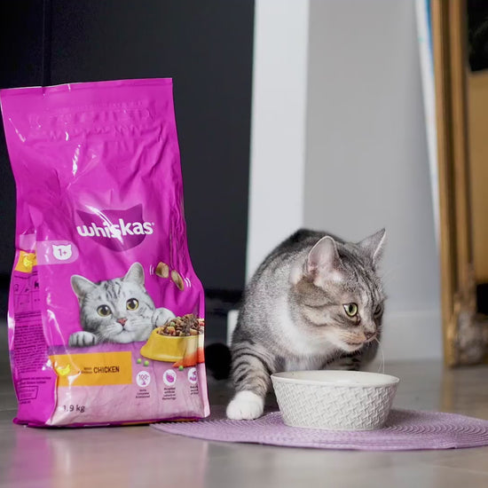 Provide your cat with complete and balanced nutrition with Whiskas 1+ Adult Dry Cat Food with Chicken. Specially formulated for adult cats aged 1 year and above, this tasty dry cat food combines real chicken, carrots, and peas to deliver a delicious and nutritious meal your cat will enjoy every day.